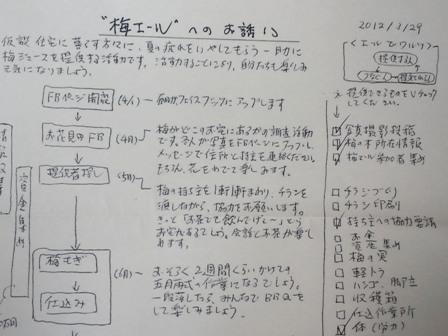 先日のセミナーの時にメンバーの一人から提案がありました。昨年は自身の会社のことで一杯で震災ボランティア活動もほとんど出来なかったけれども何かお役に立ちたいと「梅エール」プログラムを発表。もぎ取り手のいない梅の実をもらいうけジュースにして仮設住宅に住んでいる方々に届けようというもの。梅の実探しから製造、お届けまで、自分の出来るものを提供しながら参加するという企画です。