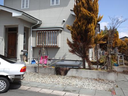 昨日の日曜日、強風で斜め45度に傾いたゴールドクレストの立直しをすることに。まずは2/3ほどをノコギリでカットし頭を軽くしてやりました。身軽になったとは言え曲がった幹は人の力では復元できず車を使うことに。リヤバンパーを取り外しフックにロープをかけて引っ張ると見事に垂直に戻りました。下枝に支えをかませて無事終了。完成後に集まってきたご近所の方々から歓声が上がっていました。