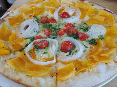 以前妻と上山市権現堂のピザの店に行きました。チラシか何かで見たらしい。2種類のピザを注文した後、外に出ると雪解け水が勢いよく流れる小川がすぐ脇にありボーッと眺めていました。そろそろかなと店に戻ると出てきたのが黄色いピザ。カボチャのスライスが載せられています。口に入れた瞬間、たまねぎが踊りだす感じ。誠においしい。値段は決して高くないのです。生ハムのピザも驚きの味でした。