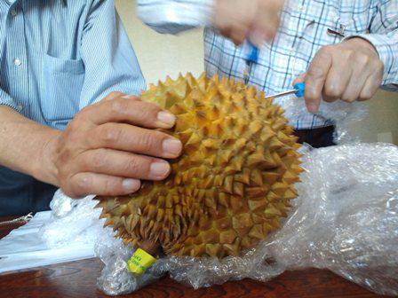 先日の土曜日は山形県青年海外協力協会の総会。飯田温泉の会議室で2時間半の議論が行われました。新しい理事も決定し楽しくなりそうな気配。会議が終了するとおもむろに取り出されたのがドリアン。ヨークに買い物に行ったときに発見したそう。前で動かずに立っていると奥さんが「明日の会議に持っていったら」と後押ししてくれたと。ナイフを入れ皮を割ってみんなで手づかみでドリアンを堪能。