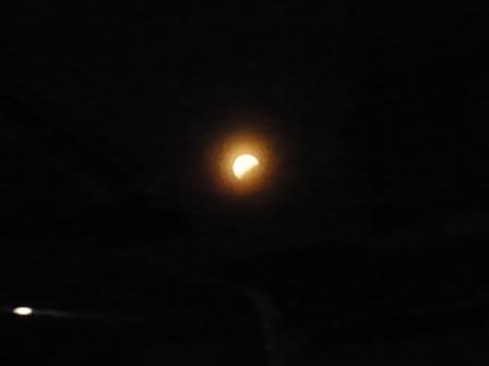 昨日自宅に帰ると近所の人たちが外に集まっていました。にぎやかに談笑していました。どうやら月食を観察していたよう。双眼鏡を持って「欠けてる欠けてる」と。みんな肉眼では欠けた様子がつかめない世代。私も双眼鏡をのぞかせてもらうと確かに緩やかな曲線で月に影が。地球の影と言われると「オーそうなんだ」と思えなくも無い感じ。携帯でアップで撮ると意外と形がはっきり写っていました。