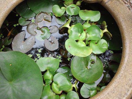 昨日お伺いしたお客様はご主人が骨董品集めが大好き。ご自宅の前にはいろいろな珍物が飾られています。奥様の物は何か〜?と尋ねてみると「私のはこれ」と見せてくれたのが鉢に植えられた睡蓮。玄関前の通路に3〜4鉢ほど。よ〜く見るとやや赤みを帯びた魚が動いています。3年たったメダカだと。「毎日エサをやっているの。かわいいの!」と。冬場は室内に移して飼っているそうです。