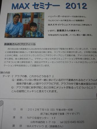 本日PM4:00からMAXセミナーが開催されます。ハンバーガーのセミナーではありません。ウエストフィールドカレッジ准教授のMAXサイトウさんの講演。独身男女が一緒に歩いているだけで逮捕されるサウジアラビアがアラブ諸国の中で最も親米的なのはなぜ?アラブ諸国で紛争が起こると日本にメリットが出るとはどういうこと?こんな疑問にスッキリ応えてくれます。常識が覆されるところが魅力です。