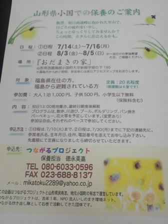 昨日ご来店いただいたお客様は福島県在住のご家族を山形でくつろいでもらうプログラムを計画。ネットに流したところ半日で参加者が埋まったそうです。場所は小国町の「おだまきの家」を中心に川遊びやバーベキューなどを行う予定。参加者は20名。スタッフは50代の女性が中心。力仕事もあるよう。なんとか若い男の人が入ってくれないかとボランティア募集中。私も強力に勧誘を受けました。
