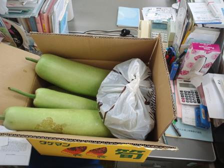 昨日ご来店いただいたお客様は事務所に入られると「エンドウさんは?」と。外出中のことを伝えると「さっき来てもらたどきやんのわすっでよ」と、何かご持参いただいたよう。一緒に車まで行ってみると段ボール箱にユウガオ6本とピーマンが一袋。お客様から農産物をいただくのはお客様に寄り添った営業をしたことの証というのが当社の説。どっさり頂いたユウガオを社員の机の上に載せておきました。