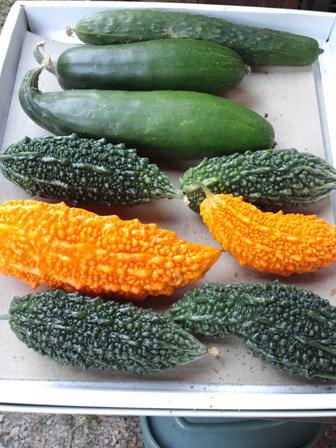 写真は本日の我家の畑の収穫。今年はゴーヤの成りが今ひとつ。大きくなるのを待っていたら黄色くなってしまいました。