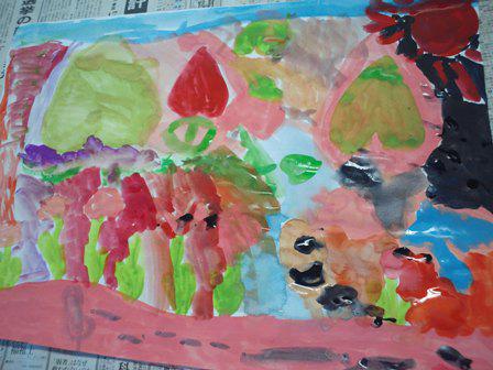 昨日お伺いしたお客様では居間で孫さんが絵を描いていました。大胆に絵具を塗りこんでいきます。これは何?と聞くと桃と、これは?太陽、これは?おばけ、と。なるほど言われればそうも見えます。点々と黒い色をつけ始めました。それは何?と尋ねるとおばけの足跡と。おばけには足がないと聞かされていたものですが彼女にはそんな理屈は関係ないといったところ。最後に恐竜の目を描いて完成。