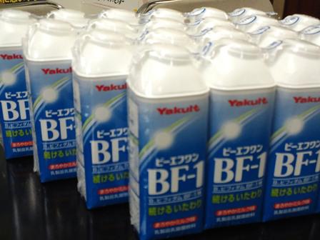 本日お伺いしたお客様はヤクルト販売の仕事をしておられます。先日健康診断で胃の精密検査の指摘を受け、内視鏡検査の結果ピロリ菌による胃炎があると言われたことを話すると「これがいい!」と出してくれたのがBF−1という新商品。ヤクルトが開発した胃に届くビフイズス菌とのこと。空腹時に飲むといいらしい。冷蔵庫に入れておけば大丈夫とのこと。1ケ月分を購入、2本ほど飲んでみました。