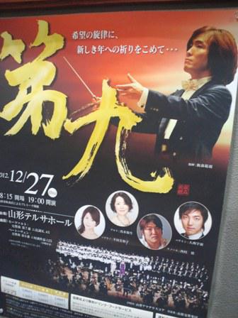 昨日はテルサにて山形交響楽団の「第九」のコンサートがありました。午後7時からの開演でしたが間に合わず第2部から入場。今年は合唱のメンバーをオーデイションで選抜したとのこと。飯森さんの指揮も迫力ありましたが、合唱団のみなさんの熱唱も迫力ありました。演奏後のカーテンコールで飯森さんが演奏者一人ひとりに拍手を送りながら労をねぎらっていたのが印象的でした。