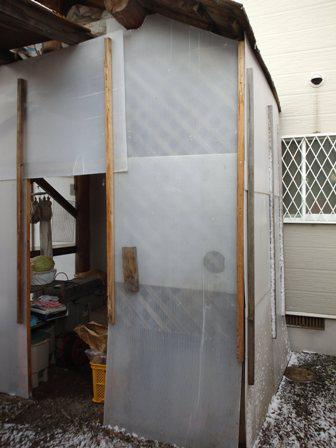 昨夜お風呂に入っていると外はビュービューの風音がしていました。「強い風だなあ」と思いながら風呂から上がると戸外で「ビシビシッ」と破壊音が。裏口を開けた妻が「壊れてる」と。裏口の雪囲いのために貼り付けたプラスチックボードが剥ぎ取られています。放置すればどこかに飛ばされていきそう。夜の11時半に電動ドリルを取り出し長いビスを打ち込み修復作業成功。体は雨でびしょ濡れでした。