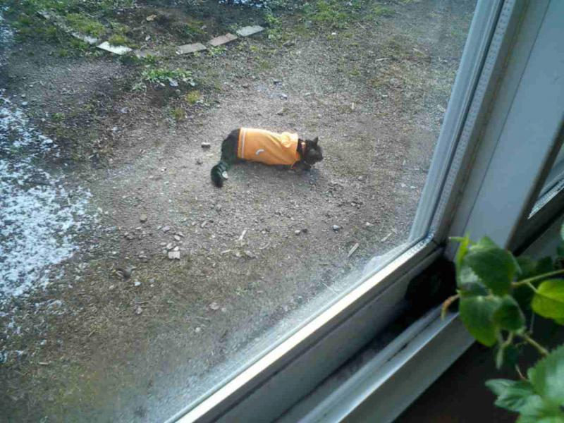 昨日の日曜日、家の外を何か黄色いものが動きました。何かと思いきや黄色い服を着た猫でした。その黄色い猫はどことなく足取りがおぼつきません。ケガをして治療をしたために飼い主が服を着せたのかもしれません。そこへ別の猫が現れました。すると黄色い猫は地面にはいつくばったのです。戦闘する意思はないよということを宣言するかのようでした。別の猫は悠々と前を歩いて行ったのでした。