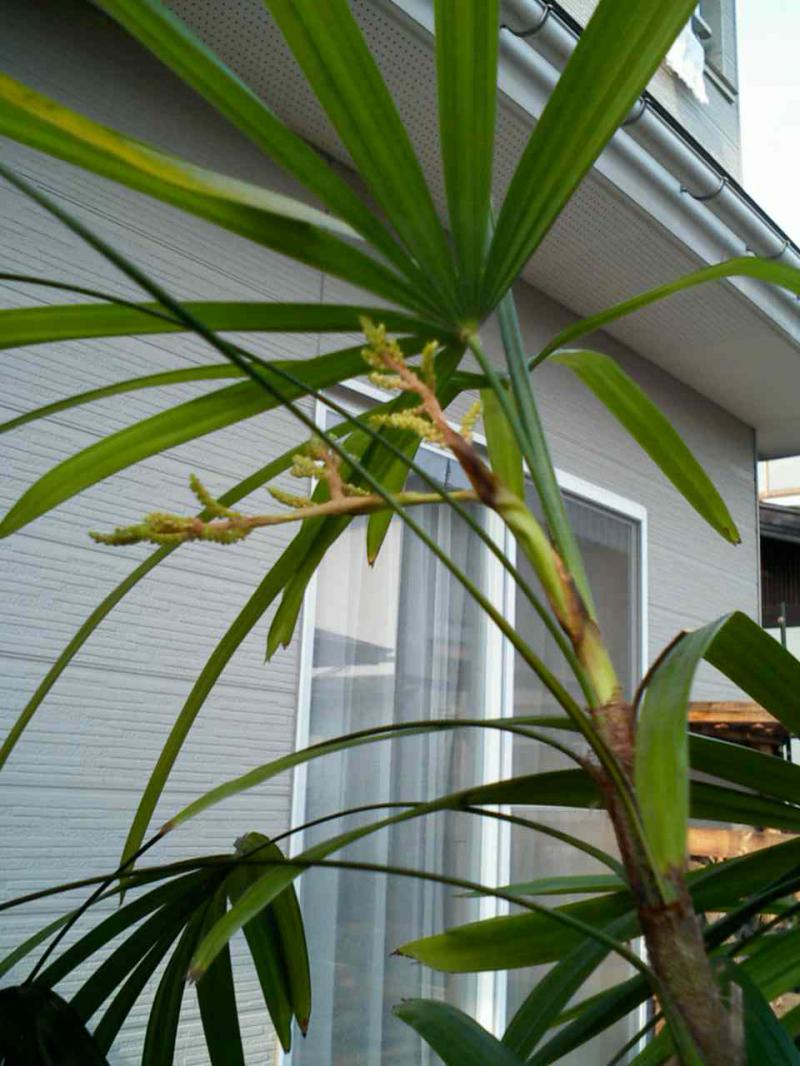 昨日の日曜日、リビングにあるシュロを外に運び出し水洗いをしてやりました。葉っぱにほこりがかかり白っぽくなっていましたが、水で流され緑色に復活。見るとシュロの幹の先端に緑色の稲穂のようなものがついています。シュロの花なのでしょうか。シュロも花を咲かせるんですね。