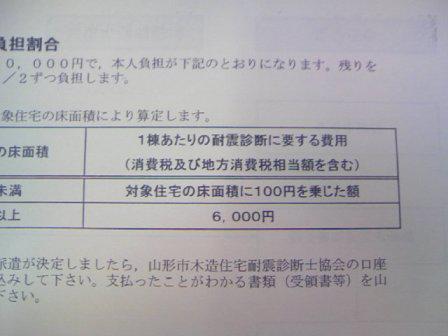 昨日お伺いしたお客様は建築設計の仕事をしておられます。今回、山形市木造住宅耐震診断の事務局を担当することになったそうです。1戸当たりの診断経費は6万円ほどかかるのですが9割は市と国で負担し、自己負担は6,000円とのこと。申込みは8/6〜8/7、今年度は50戸予定だそうです。良好な診断結果が出た場合は地震保険の割引ができるようになればと思っているとのことでした。