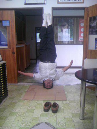 昨日ご来店いただいたお客様は肩こりに悩まされておられました。「何か効果的なことはないだろうか?」とのこと。逆立ちを勧めました。頭の後ろに手を組んでゆっくりと足を伸ばし、ゆっくり戻るというもの。事務所の床に段ボールをしいて実践したところ、さっそくお客様も挑戦。バランスが良いようで頭だけで立っていました。効果について聞いてみると。「血がのぼっただけのよう。」とのことでした。