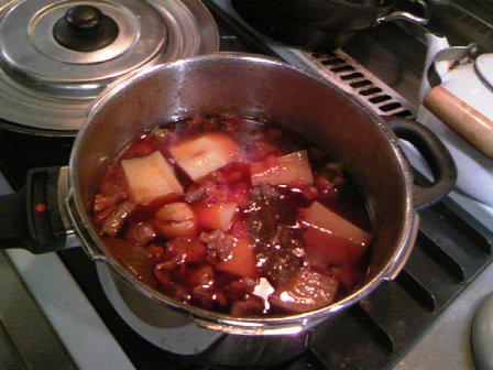 昨日の日曜日、妻がインターネットで注文していた圧力鍋が届きました。ついてきた調理案内を見るとやたらと短い時間で出来てしまうよう。さっそく牛のすじ肉を買ってきて大根や調味料を入れて作ってみました。沸騰時間15分、そのあと15分ほどそのままにしふたを開けてみると、肉、大根はトロトロに出来ていました。肉の脂身が多かったせいか、結構脂っこいすじ肉の煮込みになりました。