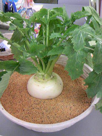 昨日お伺いしたお客様は農家で野菜作りをしておられます。最近は関東地方で海外からの研修生を農協が斡旋し野菜栽培が行われているとのことで、それら低コスト商品との価格競争があり大変なのだそうです。何かいい方法はないかと模索しているとのこと。株が上がるようにと今年も鉢植えの「かぶ」をいただいてきました。今年は植える時期がちょっと遅れたため「かぶ」が小さめなのだそうです。