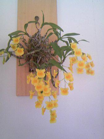 数年前に大沼デパートで蘭展があり見に行きました。木に根っこを絡ませただけの蘭があり、珍しくて買ってきました。その年は花を咲かせてくれたのですが、翌年からは全く花の気配がなく過ぎました。今年は9本もの花芽を出し黄色い花がいっぱいに咲いてくれました。昨年の夏場の肥料が良かったものと思われます。肥料として使ったのは毎日の生ゴミを利用して作っているEMボカシの液肥です。