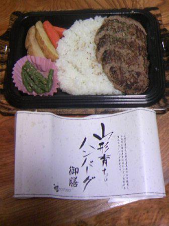 昨夜雪がブュンブュンと降る中、妻を山形駅まで迎えに行きました。関東は快晴で東京駅を出るときは火事かと思えるほどの夕焼けできれいだったと言って嘆いていました。お土産があるという。東京駅の地下で買ってきたものらしい。ハンバーグ弁当でした。材料は山形県産の牛肉と豚肉とあります。その店の一番のおすすめ商品だったとか。山形県産ということばの影響なのか味はかなりいい。