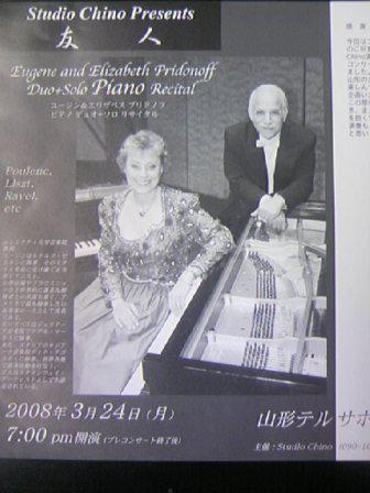 先日お伺いしたお客様からコンサートを紹介されました。シンシナティ大学音楽院教授をしているプリドノフさんのピアノの演奏会です。現在、山形でピアニストとして活動している知野礼美さんの恩師とのこと。その縁で今回山形で演奏会を開くことになったそうです。小澤征爾さんとも共演をしてきた方らしい。チケットが割安なのは多くの人に聴いてもらいたいという主催者の思いからとのこと。