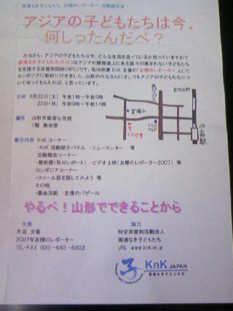 昨日イベントの案内が送られてきました。「国境なき子どもたち」というNGOのレポーターとしてカンボジアに行った報告会を行うというもの。主催は中学生の大沼文香さん。自分や自分の身内の利益に直接関係しないことを自分が主催者として行うのを社会性の高い生き方と考えます。今回のイベントは実に社会性の高い活動だと思います。「やるべ!山形でてきることから」というメッセージに共感します。