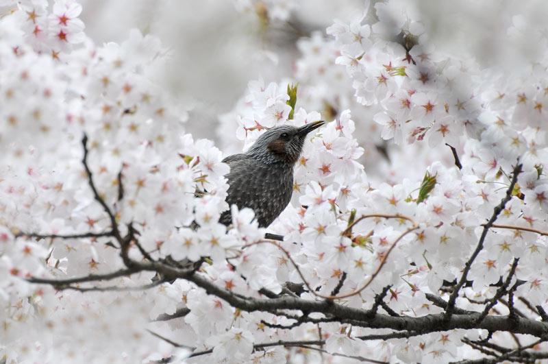 桜の花の蜜を吸うヒヨドリを撮ってみました。