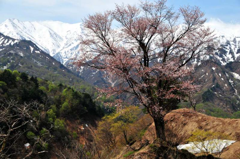 峠道にある大山桜は散り始めていました。