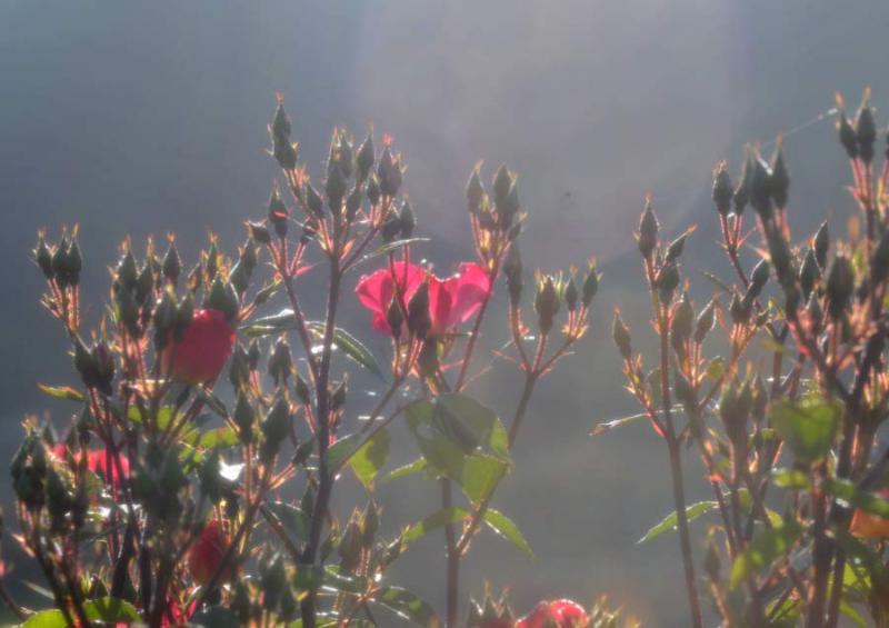 朝の光に輝いて、まだ咲き始めのバラとつぼみたちが輝いてました。