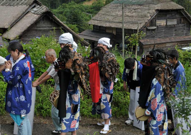 集落を回り終えて獅子踊りを奉納する円照寺跡に戻るところです。