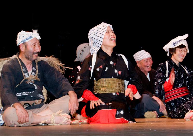 兼続が百姓たちと会話をして一同を笑わせているところです。