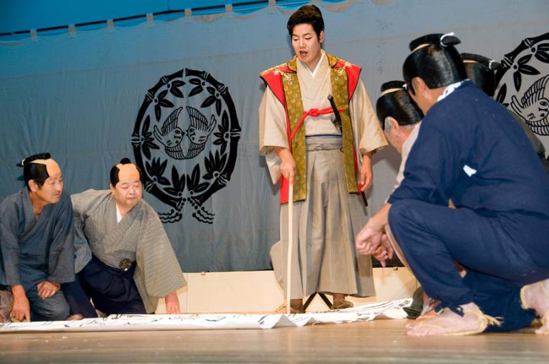 兼続が地図をひろげて家臣たちと「会議」をやっています。