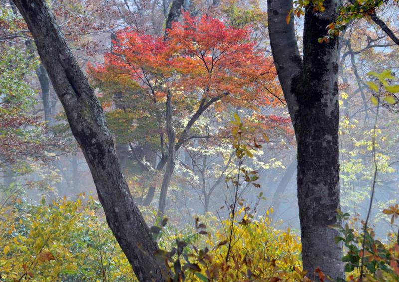 朝霧の中のブナ林で撮りました。