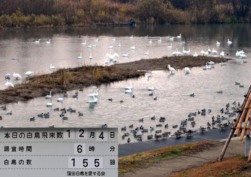 千眼寺裏の最上川上流(松川)には今日現在,155羽の白鳥が飛来してました。
