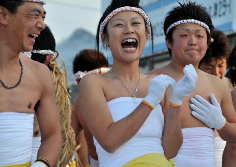 写真は、休憩中のわらじ神輿の担ぎ手の若者たちのです。