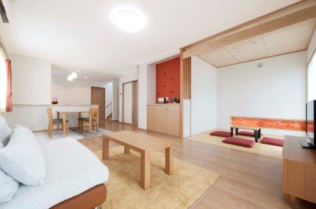 リビングが20帖+畳コーナー3.7帖の4LDK+食品庫、ウッドデッキや