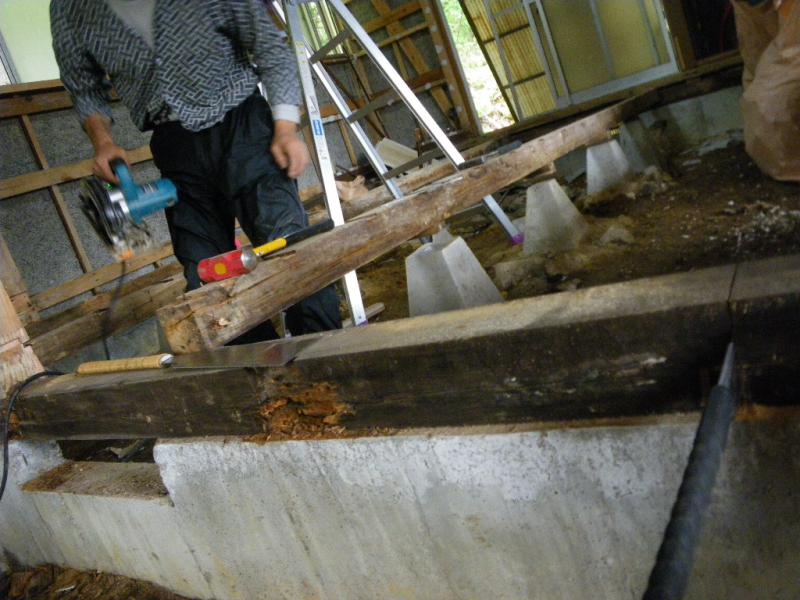 と言うわけで、大工さんに手伝ってもらい大引(おおびき)を入れ替え。