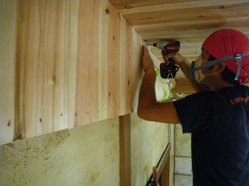 今日も大工さまと2人仕事で、壁の上部に板を張る。