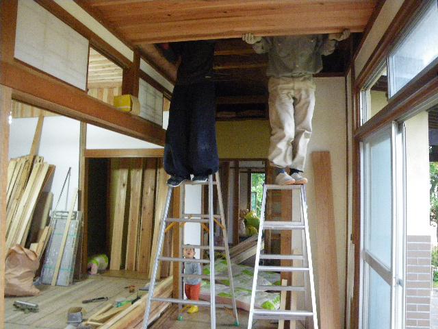 昼過ぎに来てくれた大工さんと、東側廊下の天井張り。