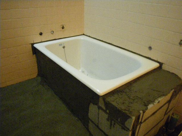 ほんで今日は浴槽の設置と床の下地モルタル塗りまでして頂きました。