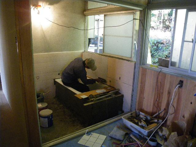 この白いタイルは既存のピンクタイルの上から重ねて貼っていました。