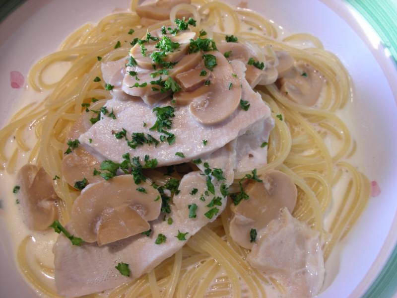 写真はチキンとマッシュルームのクリームチーズのパスタ。