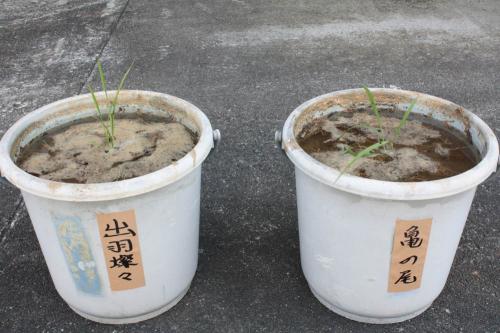 「ゲリラ豪雨」が猛威を振るった梅雨が明けましたが、今度は猛暑日が続いています。 気温が40℃近くに達する場所も出ており、熱中症で倒れる方も毎日のように出ています。 皆様お体には充分お気を付け下さい。 とは言え、雨が続いた後にこの日差しとなれば、稲にとって良い条件ばかりです。 さて、バケツ栽培の成長記も5回目となりました。 夏休みに突入した学校もあり、子どもたちは各々夏休みをエンジョイされることと思います。 小学生のお子さんの「夏休みの自由研究」にぴったりのバケツ稲栽培、ご自宅で行われている方は、お子様に任せてみてはいかがでしょうか? それではまず、前回更新の様子をふり返ってみます。 ![]() この時点で草丈が全品種とも80cmを超えて、やっと「稲」らしくなってきた、といった感覚がありました。 そして21日に撮影した様子が、コチラの画像です。 ![]() 今回は草丈などに目に見えての生長はありませんが、稲の中では… 詳しくは、毎回恒例となっております「当社所属の米作りのプロ」よりのコメントでご確認ください。 〜〜〜〜〜〜〜〜〜〜〜〜〜〜〜〜〜〜〜〜〜〜〜〜〜〜〜〜〜〜 豪雨が続いた今年の梅雨でしたが、平年より1週間ほど早い梅雨明けとなりました。 梅雨が正式に明け、これからは暑い日が続きます。 暑い時こそ、体調管理に気をつけたいものです。 バケツの稲は、最高分けつ期を過ぎ茎数がやや減りました。 人間のお腹の中にあたる部分では稲穂の赤ちゃん「幼穂」が生長しているところです。 前回と比較すると、葉令が0.5〜1枚の生長なので、草丈にもほとんど変化は見られません。 ですが、今後に控える「出穂」と共に草丈はぐんと伸びてきますので、ご心配なく。 ☆ バケツ栽培への ワンポイントアドバイス ☆ ―こまめに水やりを!― 梅雨も明け、これからは日中の気温が本格的に上がってきます。 稲も生き物ですから、自分の体を守るために、葉から水分を蒸散させて体温を下げます。 暑くなればなるほどこの蒸散が活発に行われる傾向にありますので、1日1回の水やりでは水が足りなくなる事もあります。 バケツの水かさに気をつけて、枯らしてしまわないように注意してください。 志賀 〜〜〜〜〜〜〜〜〜〜〜〜〜〜〜〜〜〜〜〜〜〜〜〜〜〜〜〜〜〜 いかがでしたでしょうか?バケツ栽培をされてる方の参考になれば幸いです。 ★田植え祭りの経過報告 5月末に行いました田植え祭りから、早2ヶ月が経とうとしています。 ご参加いただきました皆様に、あの時の田んぼの「今」をお見せしようと思います。 まずは、田植えから10日後の様子をご覧ください。 まだ、植えた当時の面影が残っています。田んぼの土も見えますよね。 では、7月21日現在の様子をご覧頂きましょう。 ![]() …いかがでしょうか?大分稲らしくなっているのがわかって頂けるかと思います。 10月には、この稲の刈り取りを兼ねた「収穫祭」を行う予定です。 田植え祭りに参加された方・この記事を読んで興味を持たれた方がいらっしゃいましたら、ぜひ参加して頂ければと思います。 引き続き、米鶴ではバケツ栽培されている方からの写真投稿をお待ちしております。 提供頂ける方は、 ・デジカメや携帯電話などで撮ったバケツ栽培の写真 に一言コメントを添えて、info@yonetsuru.comまでメールをお送りくださいませ。 皆様のご協力、お待ちしています。 他にも疑問・質問はもちろん、ホームページを見ての感想などでも結構ですので、問い合わせフォームにお寄せください! 次の更新は、8月1日が休日ですので、翌日8月2日を予定しています。次回はどのような生長を見せてくれるでしょうか?楽しみです。 それでは、次回更新までごきげんよう! ↓まほろばの酒蔵 米鶴酒造のホームページははこちら↓ 米鶴酒造株式会社 公式ホームページ【別ウィンドウが開きます】 |