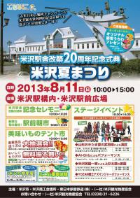 米沢駅舎改築20周年をお祝いして 日時 平成25年8月11日(日)10:00〜15:00 米沢夏まつり【テント市・朝市・ステージイベント・大抽選会】 ◇ご来場特典 ・かねたんうちわプレゼント! ◇かき氷、玉こんにゃく、漬物 おふるまい! ◇ステージイベント! ◆Ai-Girlsによるパフォーマンス 11:20 〜11:50 ◆米沢民謡一家による上杉太鼓の披露 12:00〜12:30 14:00 〜14:30 ◆YOZAN戦士アズマンジャーパフォーマンス 13:20 〜13:40 〇大抽選会!! 500円以上お買い下げの方にスピードくじ 〇駅前朝市の開催!新鮮な旬の食材!9:00〜 〇美味いものテント市 ◇ちびっこのみんなあつまれ!! ミニSL乗車体験 同時開催 「米沢の物産展」 米沢牛・牛加工品・酒・民工芸品・米沢ラーメン・菓子 お問い合わせ:(一社)米沢観光物産協会 TEL(0238)21−6226 主催:米沢市・米沢商工会議所・東日本旅客鉄道(株)・(一社)米沢観光物産協会 |