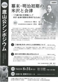 日時 平成25年8月31日(土) 午後1時開場 場所 伝国の杜 置賜文化ホール タイトル 幕末明治初期の米沢と会津 −八重の桜を契機として米沢会津の関係を再考するため―