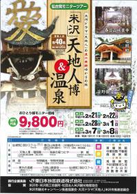 大河ドラマ天地人の直江兼続ゆかりの地 「米沢」天地人博&温泉 お一人様モニター価格 旅行代金 9,800円 ※小人も同額となります。 ※2名様以上でお申込ください ※行程中の入場料・拝観料はツアー料金に含まれます。 食事/朝食1回付・夕食1回付・昼食(初日)付 出発日 第1回 平成21年2月21日(土)〜2月22日(日) 宿泊場所:小野川温泉 第2回 平成21年2月28日(土)〜3月1日(日) 宿泊場所:白布温泉 第3回 平成21年3月7日(土)〜3月8日(日) 宿泊場所:小野川温泉 募集人員 各40名 最少催行20名 定員になり次第募集を打ち切らせていただきます。 添乗員は同行しません。 宿泊先のご指定はできかねますので予めご了承願います。 出発の1週間ほど前に最終行程表を送付いたします NHK大河ドラマ「天地人」直江兼続ゆかりの地をめぐり 上杉博物館で開催される「米沢愛と義のまち天地人博2009」 の見学。 お昼は米沢の郷土料理を盛り込んで開発した 「兼続御膳(ぜん)」を提供 旅館での夕食にはすき焼きが付きます。 モニターツアーということで格安の 魅力的なツアーになっております。 ぜひお申込いただき 米沢へお越しください。 お申込み・お問合せは びゅう予約センター 0570-04-8950 ...もっと詳しく |