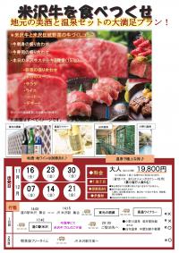 米沢牛を食べつくせ! 地元の美酒と温泉セットの大満足プラン!受付中! この度、酒蔵めぐりと米沢牛づくしのご夕食、温泉宿泊プランを企画いたしました! 目玉はなんといっても米沢牛! 今回米沢牛の生食のご提供が可能になった道の駅米沢牛毘亭で食べる 米沢牛刺身、米沢牛寿司、米沢牛ステーキの3種盛! このプランだけのオリジナル牛づくしコースです! その他、美味しい地酒、ワイン、温泉宿まで貸し切りバス(タクシー)で ご案内いたします。 料金はなんと!宿泊費も込みで おひとり19,800円! ぜひこの機会に美酒美食米沢牛づくしの旅をご堪能ください! 出発日は 11月16日、23日、30日 12月7日、14日、21日 お申し込みは一般社団法人米沢観光コンベンション協会 道の駅米沢 総合観光案内所 電話0238−40−8400 詳しくはチラシをご覧ください。 ...もっと詳しく |