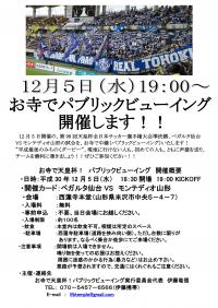 天皇杯!モンテディオ山形をみんなで応援しよう! 12月5日に開かれる、第98回天皇杯全日本サッカー選手権大会準決勝、ベガルタ仙台VSモンテディオ山形の試合を、お寺で中継(パブリックビューイング)いたします! ”平成最後のみちのくダービー” 現地に行けない人も、初めての人も大歓迎! 山形からともに声援を送り、チームを勝利に導きましょう!! ぜひぜひ、ふるってご参加ください!! 開催概要 ・会場 :西蓮寺本堂(山形県米沢市中央5−4−7) ・日時 :平成30年12月5日(水)18:30開場 19:00 KICKOFF ・入場料 :無料 ・事前申込 :不要、当日会場にお越しください。 ・入場制限 :約100名 ・飲食 :本堂内は飲食不可。飲食・喫煙は所定のスペースのみ ・駐車場 :西蓮寺駐車場(道路を挟み向い側) ※台数に限りがあります。なるべく乗合か徒歩にて お越しください。 ・注意事項 :開場前は入場できません。 鳴り物を使っての応援はお控えください。 周囲に迷惑のかかる行為(暴力等)はお止め下さい。 交通にはくれぐれもご注意ください。 ・主催・連絡先 お寺で天皇杯!パブリックビューイング実行委員会代表 伊藤竜信 〒992-0045 山形県米沢市中央5−4−7 西蓮寺内 TEL : 070−5457−6566(伊藤携帯) E-mail : lfbtemple@gmail.com 山形を決勝へ!一緒に応援しましょう!! |