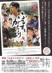 米沢市で、6/29.30日に 夢プロジェクト〜映画「ふるさとがえり」上映会in米沢〜 を開催します。 日時 6月29日(土)17:30〜 30日(日)10:00〜 15:00〜 会場 南部小学校東体育館 『夢プロジェクト』とは、地域を盛り上げようと頑張っている 熱い『夢』を持った若者同士が「新しい心の繋がり」を持って、 イベントを企画運営していくプロジェクトです。 イベントで出会った若者同士が『夢』や『希望』を語り合い、 それをカタチにしていく過程で、個々のチカラが 「新しい大きなチカラ=夢・希望」に進化(真価)していく 夢のストーリーを目指します。 その第1弾として、大学生と地元若者が集い、 「ふるさとがえり」上映会を企画してきました。 当日はこの実行委員メンバー同士、そして実行委員と 観客の方々が「ふるさと」「生きる」「夢・希望」の想いを共有し、 さらに心を繋げていきたいと思っています。 この素晴らしい映画「ふるさとがえり」を通じて、 会場の一人一人が住み慣れたこの地域で、『夢・希望』を持って、 笑顔で楽しく暮らしていくために、真心と絆の大切さを 少しでも共有できるよう、準備を進めていきます!! |