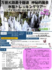 「万世大路栗子隧道 氷筍トレッキングツアー」 明治初期に山形と福島の県境に掘られた隧道(トンネル)の天井からポタリと落ちる水滴が瞬時に凍って成長する氷の筍がにょきにょきと林立する珍しい光景です。 冬だけの芸術品「氷筍」、この機会にぜひ、ご覧ください!! ◇出発日:2025年2月16日(日)・2月19日(水) ◇行 程:集合場所 JR米沢駅東口広場 |