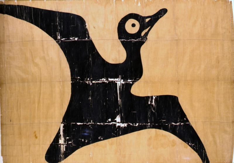 この旗は「かりがねの旗」と呼ばれ、絹の白地に墨で飛翔する一羽の雁を描いた斬新なもので、モダンなデザインです。