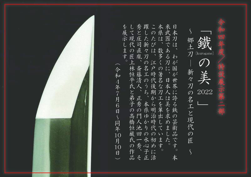 新々刀の名工のうち本県ゆかりの水心子正秀と庄司直胤、斎藤清人、正秀の門人池田一秀、そして現代の匠上林恒平氏と弟子の煖エ恒厳氏の作品を展示しています。
